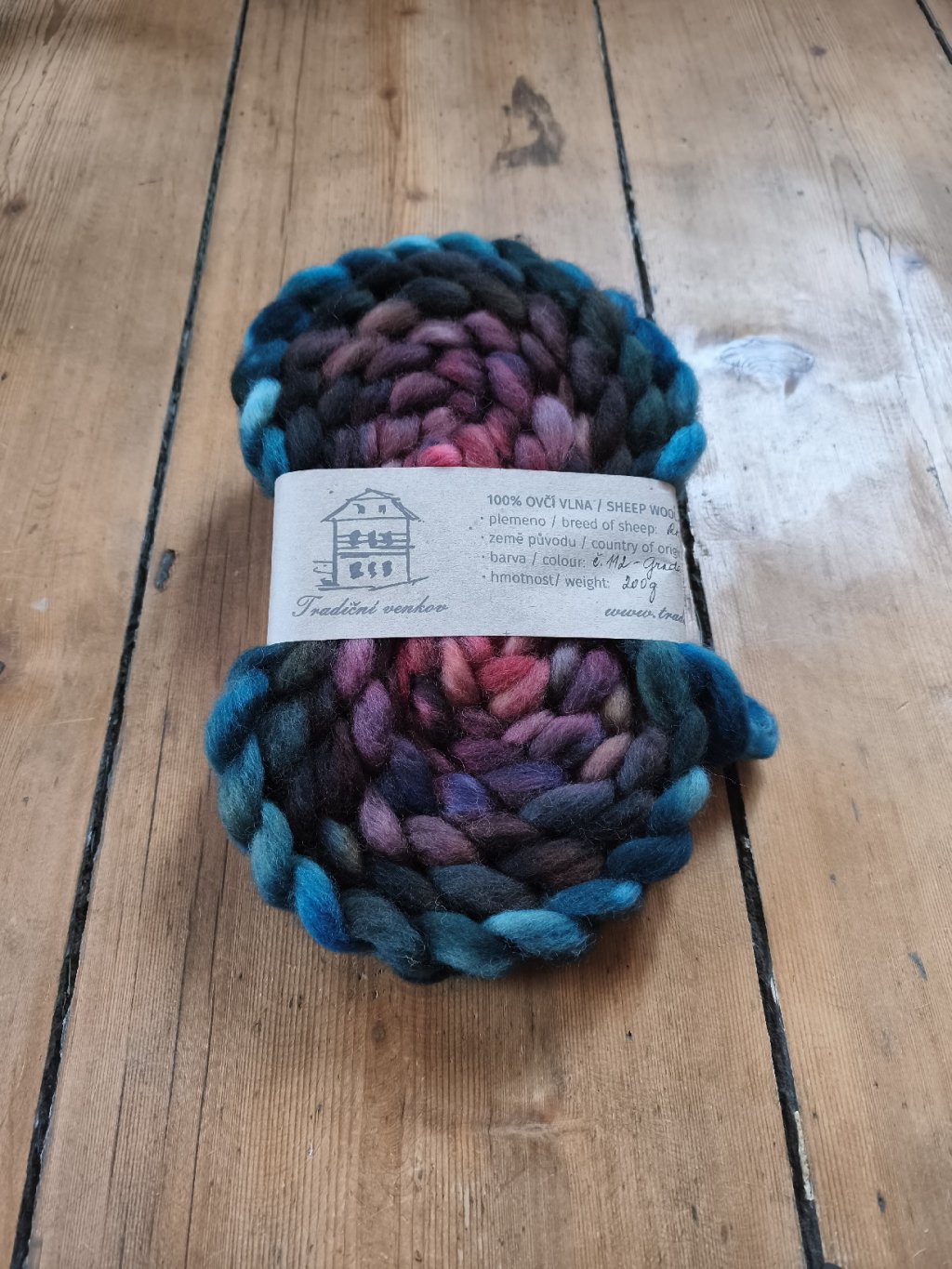 Ručně barvený česanec vlny z českých oveček plemene Romney Marsh, zpracovaný v malé manufaktuře - tzv. vlněném mlýnu a potom mnou ručně nabarvený v barvách. Česanec je zpracovaný formou "pin drafted roving", takže je krásně nadýchaný, ne tak hutný jako průmyslové česance, není ho potřeba rozdělovat ani povytahovat a velmi dobře se z něj přede.