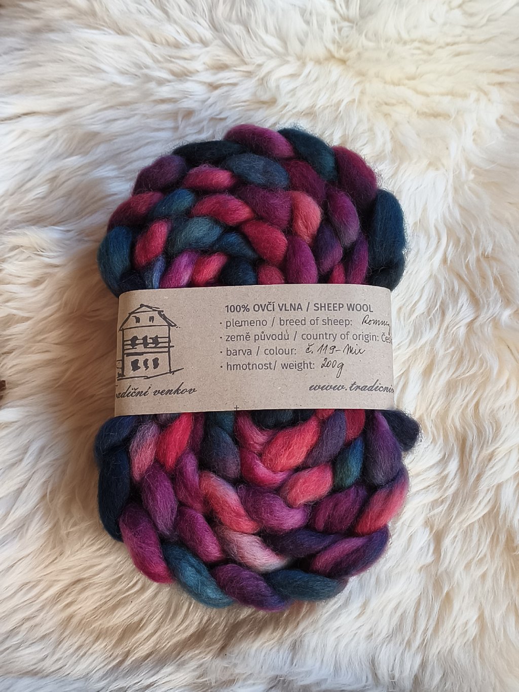 Ručně barvený česanec vlny z českých oveček plemene Romney Marsh zpracovaný v malé manufaktuře - tzv. vlněném mlýnu a potom mnou ručně nabarvený,  Česanec je zpracovaný formou "pin drafted roving", takže je krásně nadýchaný, ne tak hutný jako průmyslové česance, není ho potřeba rozdělovat ani povytahovat a velmi dobře se z něj přede.
