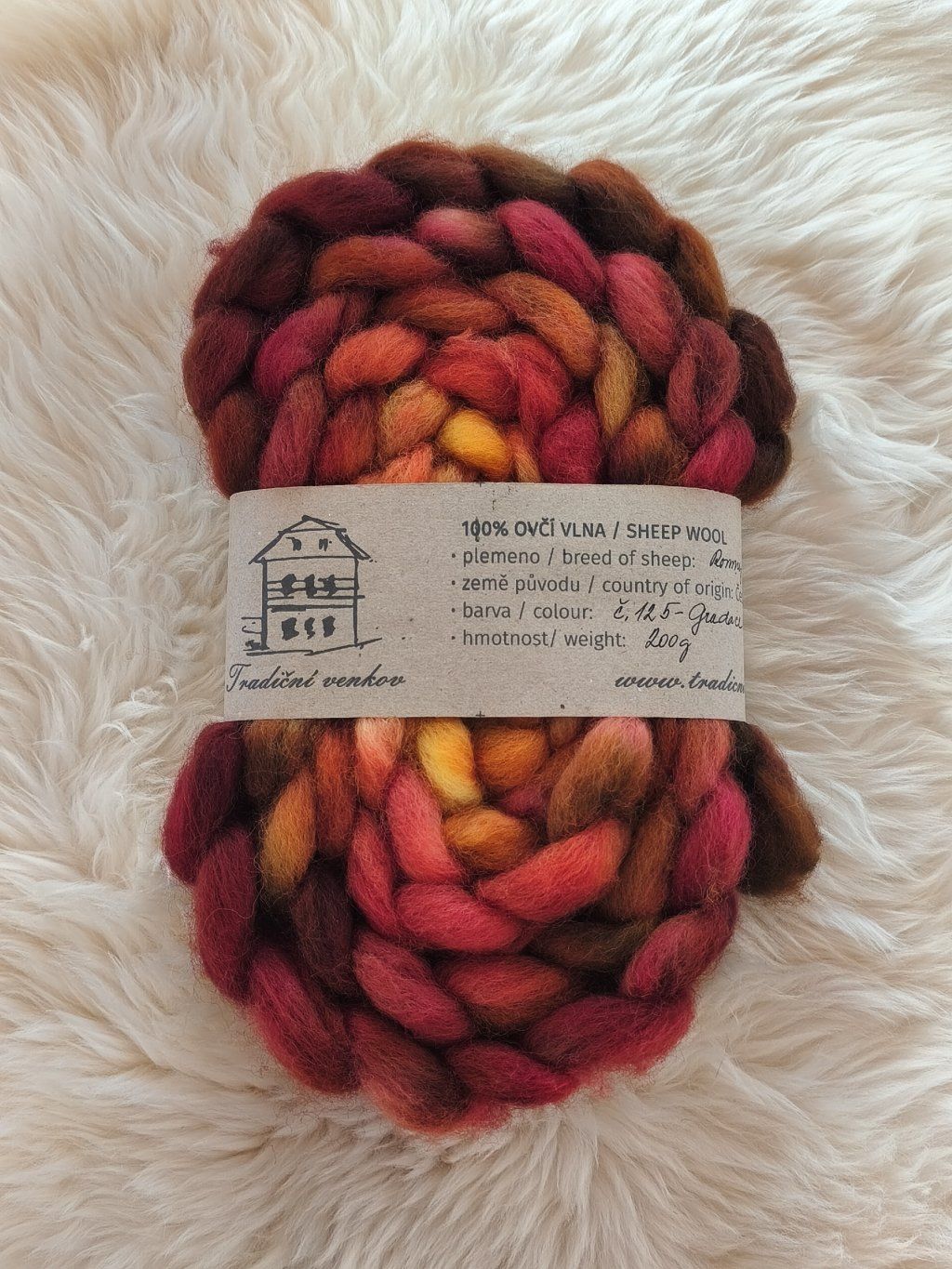 Ručně barvený česanec vlny z českých oveček plemene Romney Marsh zpracovaný v malé manufaktuře - tzv. vlněném mlýnu a potom mnou ručně nabarvený,  Česanec je zpracovaný formou "pin drafted roving", takže je krásně nadýchaný, ne tak hutný jako průmyslové česance, není ho potřeba rozdělovat ani povytahovat a velmi dobře se z něj přede. Fotky ručně předené příze jsou pouze ilustrativní.