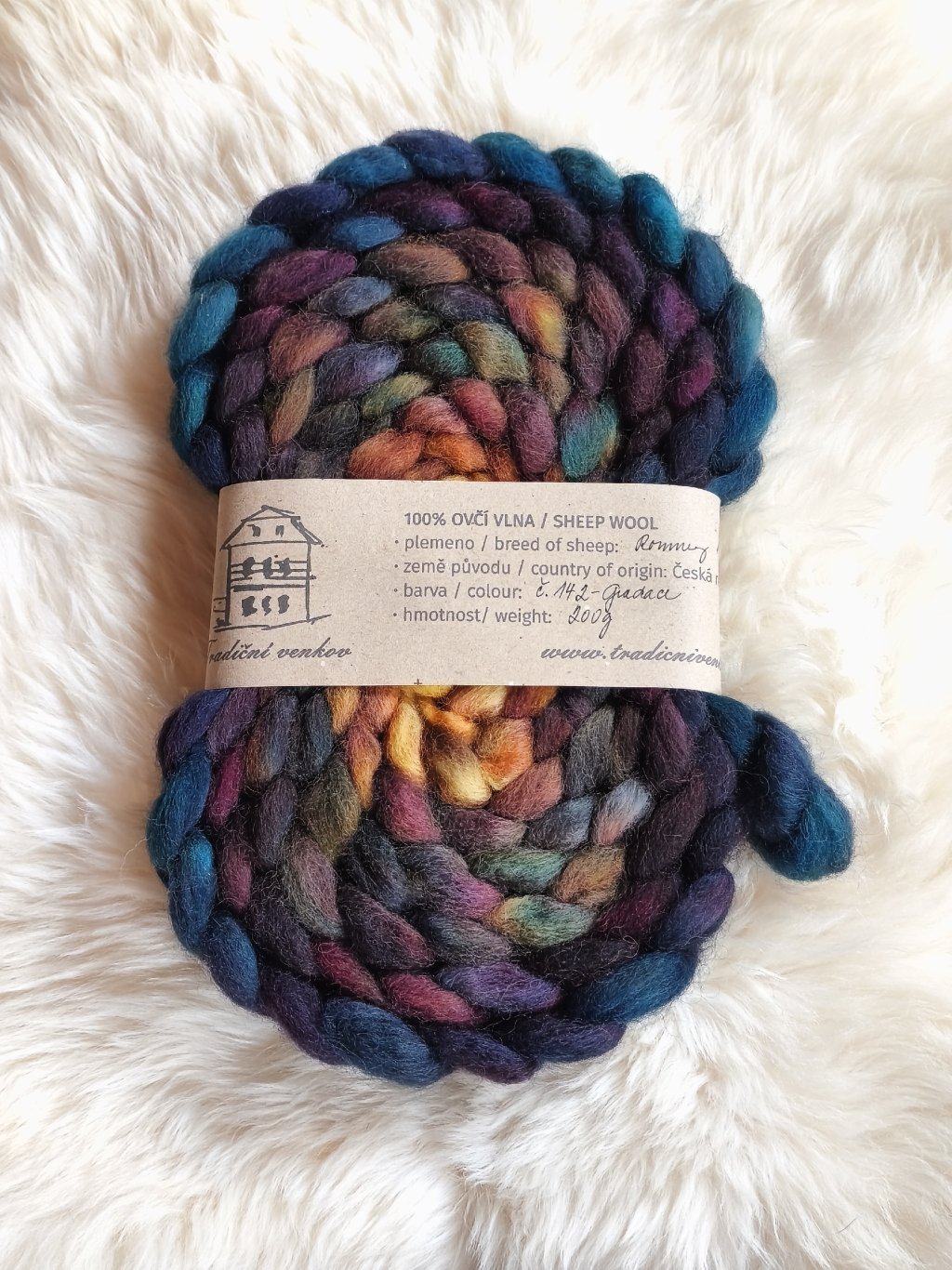 Ručně barvený česanec vlny z českých oveček plemene Romney Marsh zpracovaný v malé manufaktuře - tzv. vlněném mlýnu a potom mnou ručně nabarvený,  Česanec je zpracovaný formou "pin drafted roving", takže je krásně nadýchaný, ne tak hutný jako průmyslové česance, není ho potřeba rozdělovat ani povytahovat a velmi dobře se z něj přede.