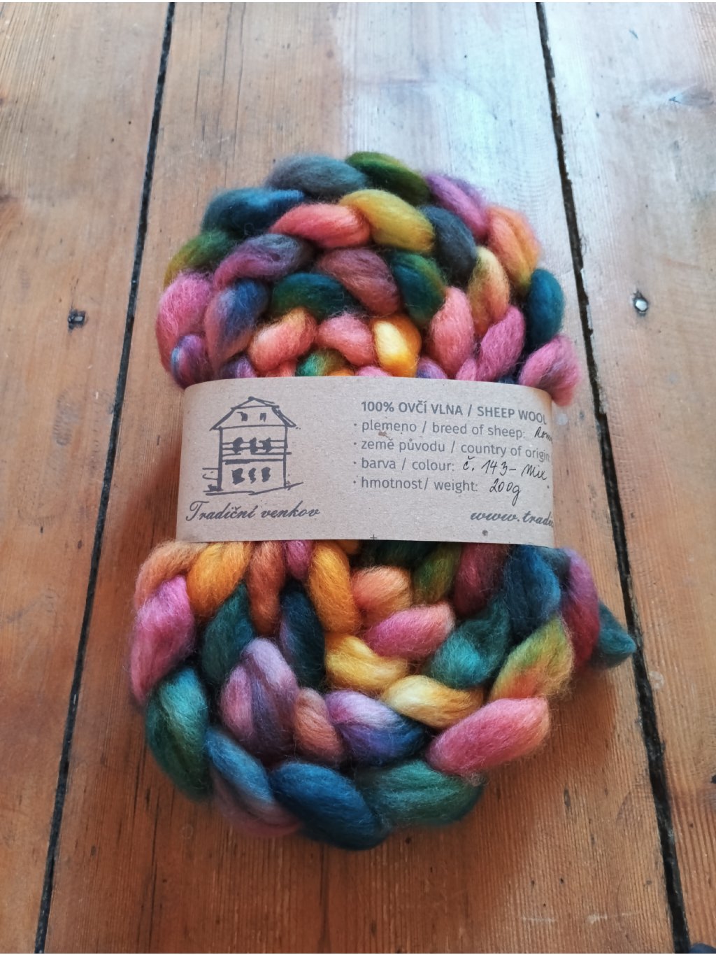 Ručně barvený česanec vlny z českých oveček plemene Romney Marsh zpracovaný v malé manufaktuře - tzv. vlněném mlýnu a potom mnou ručně nabarvený,  Česanec je zpracovaný formou "pin drafted roving", takže je krásně nadýchaný, ne tak hutný jako průmyslové česance, není ho potřeba rozdělovat ani povytahovat a velmi dobře se z něj přede.