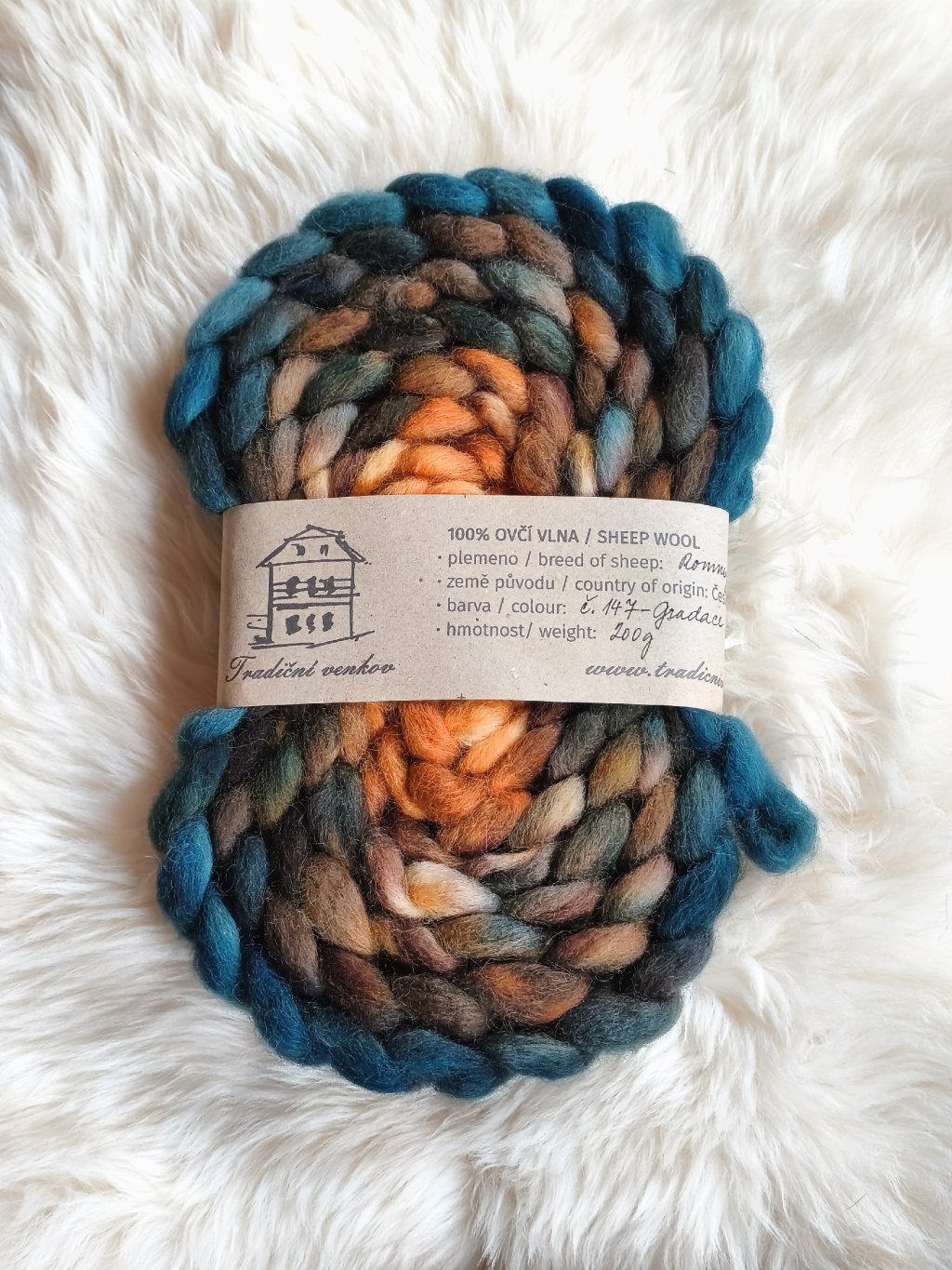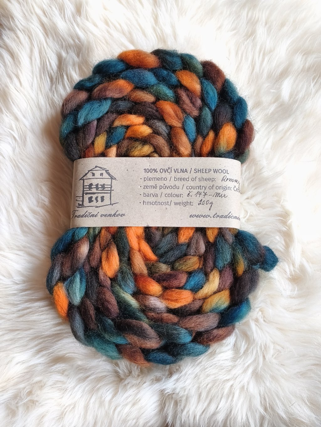 Ručně barvený česanec vlny z českých oveček plemene Romney Marsh zpracovaný v malé manufaktuře - tzv. vlněném mlýnu a potom mnou ručně nabarvený, Česanec je zpracovaný formou "pin drafted roving", takže je krásně nadýchaný, ne tak hutný jako průmyslové česance, není ho potřeba rozdělovat ani povytahovat a velmi dobře se z něj přede. Fotky ručně předené příze jsou pouze ilustrativní.