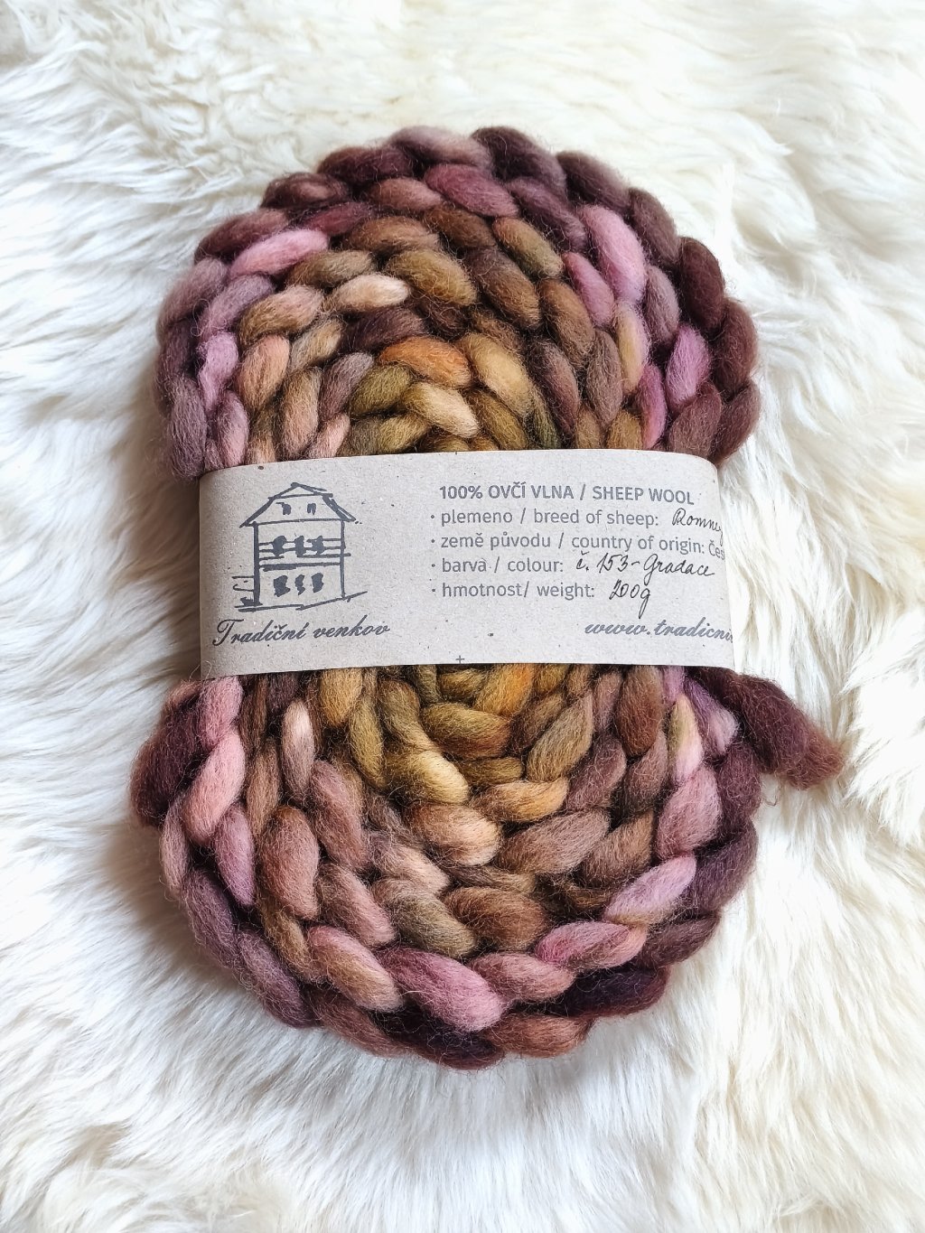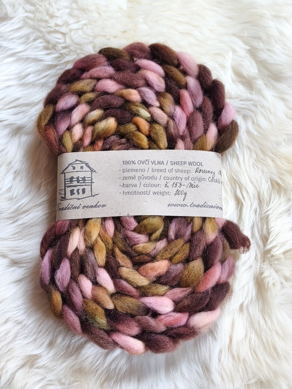 Ručně barvený česanec vlny z českých oveček plemene Romney Marsh zpracovaný v malé manufaktuře - tzv. vlněném mlýnu a potom mnou ručně nabarvený,  Česanec je zpracovaný formou "pin drafted roving", takže je krásně nadýchaný, ne tak hutný jako průmyslové česance, není ho potřeba rozdělovat ani povytahovat a velmi dobře se z něj přede. Fotky ručně předené příze jsou pouze ilustrativní.