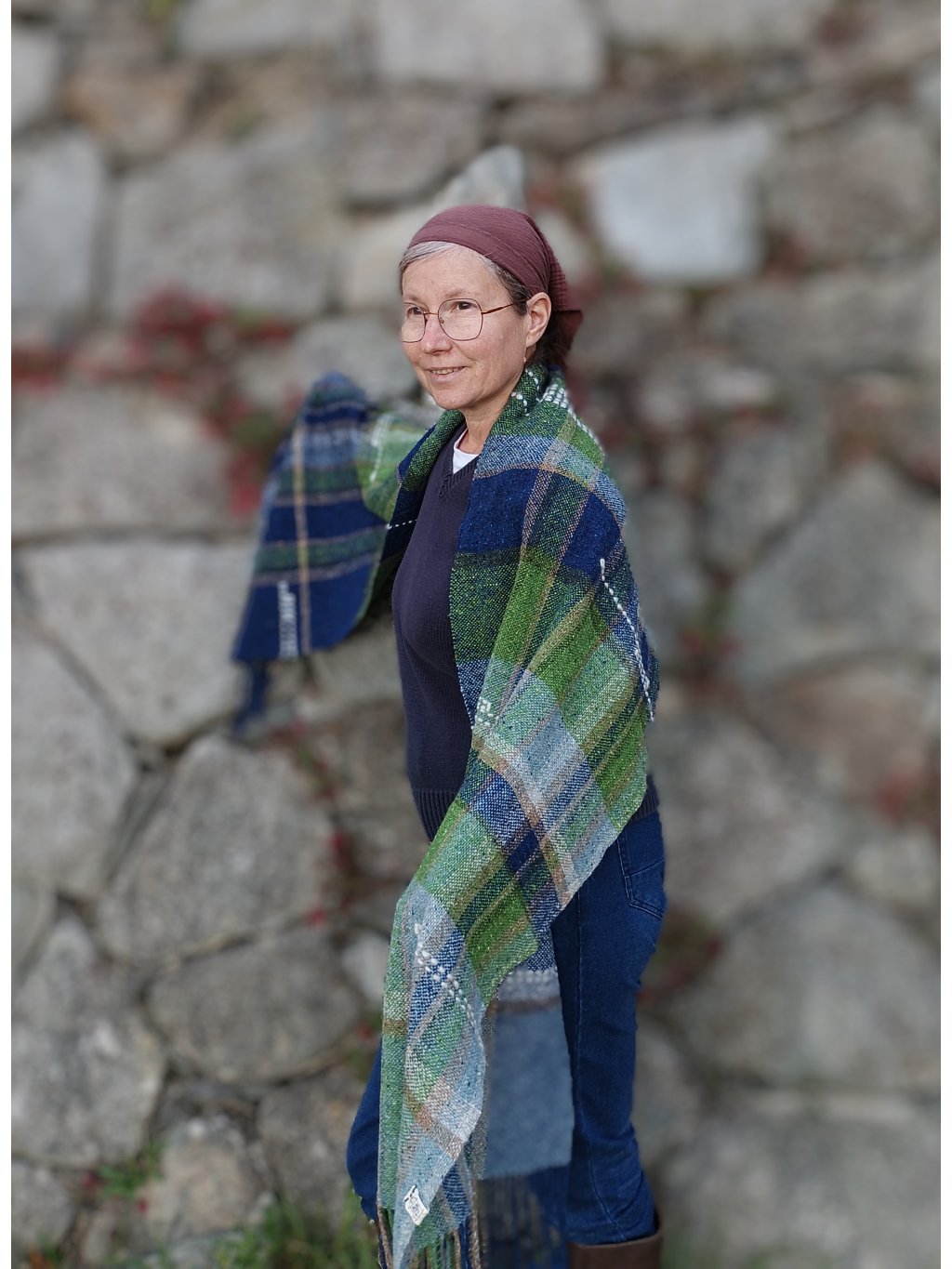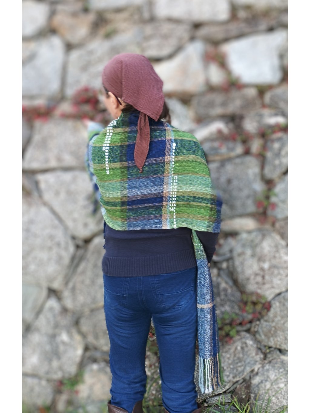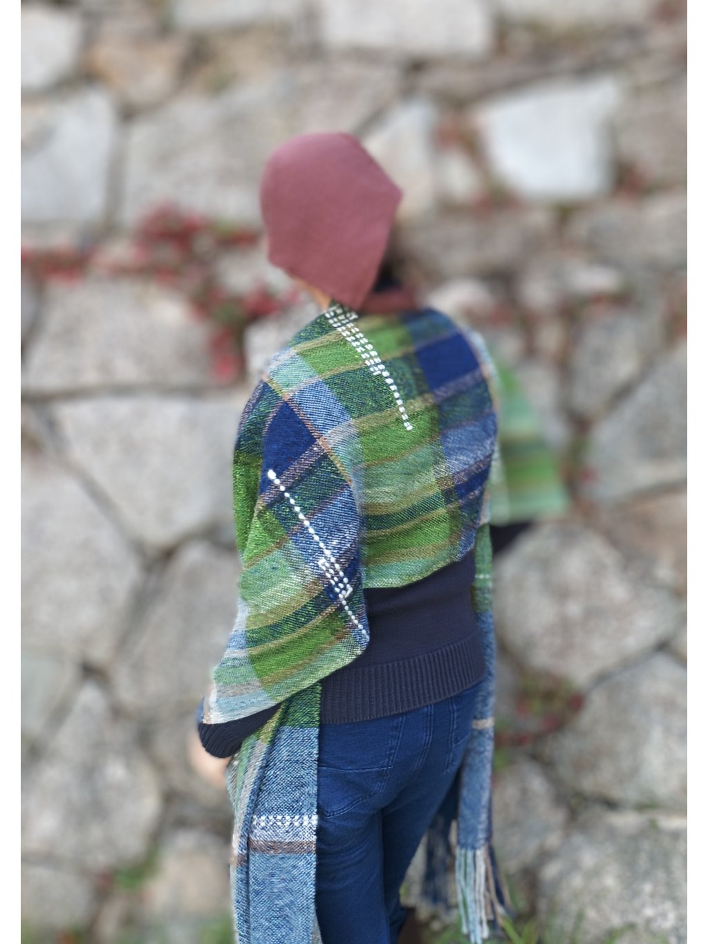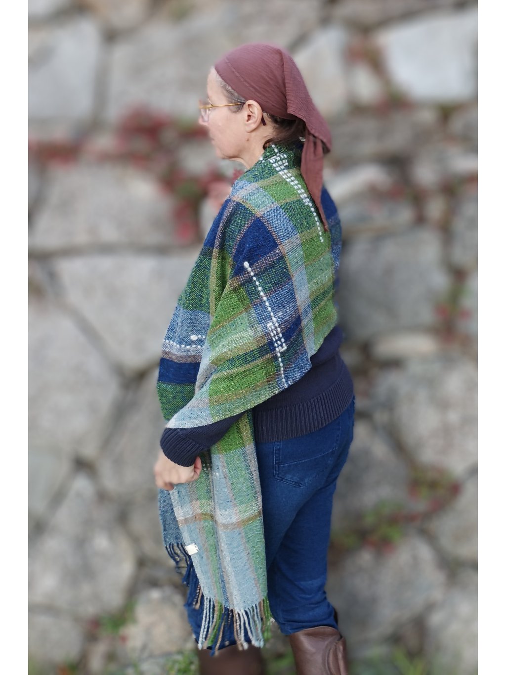 Ručně tkaná šála/pléd z tvídové merino vlny. Barevností připomíná les v podvečer, kdy koruny stromů potemní a obloha přechází pomalu do temně modré, dekorativní vsadky v geometrických linií jsou z ručně předené české ovčí vlny v přírodně bílé. Šála je velmi hřejivá, úžasně měkká a jemná, lehounká a příjemná na dotek, nekouše, ale mohou se najít výjimky s citlivější kůží. Použitý vzor je klasický a tradiční zároveň, osnova i útek jsou ze stejného materiálu a na obou stranách je zakončena kroucenými třásněmi. Barvami i vzorem je vhodná pro jakýkoliv styl a příležitost, pro ženy i muže. Šálu je možné 2 x pohodlně omotat kolem krku, nebo nosit jako pléd přes ramena. Výrobek je již jednou praný!!