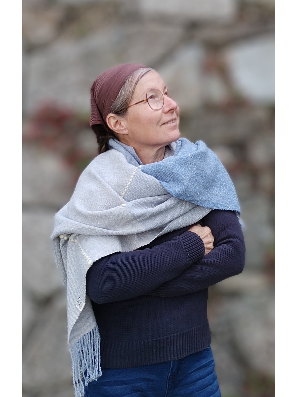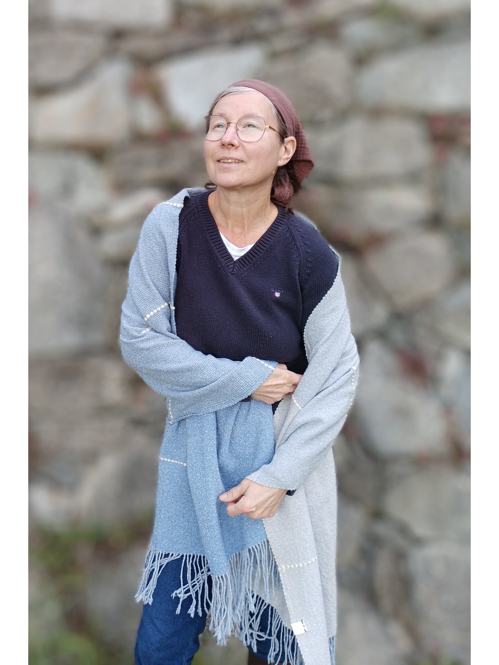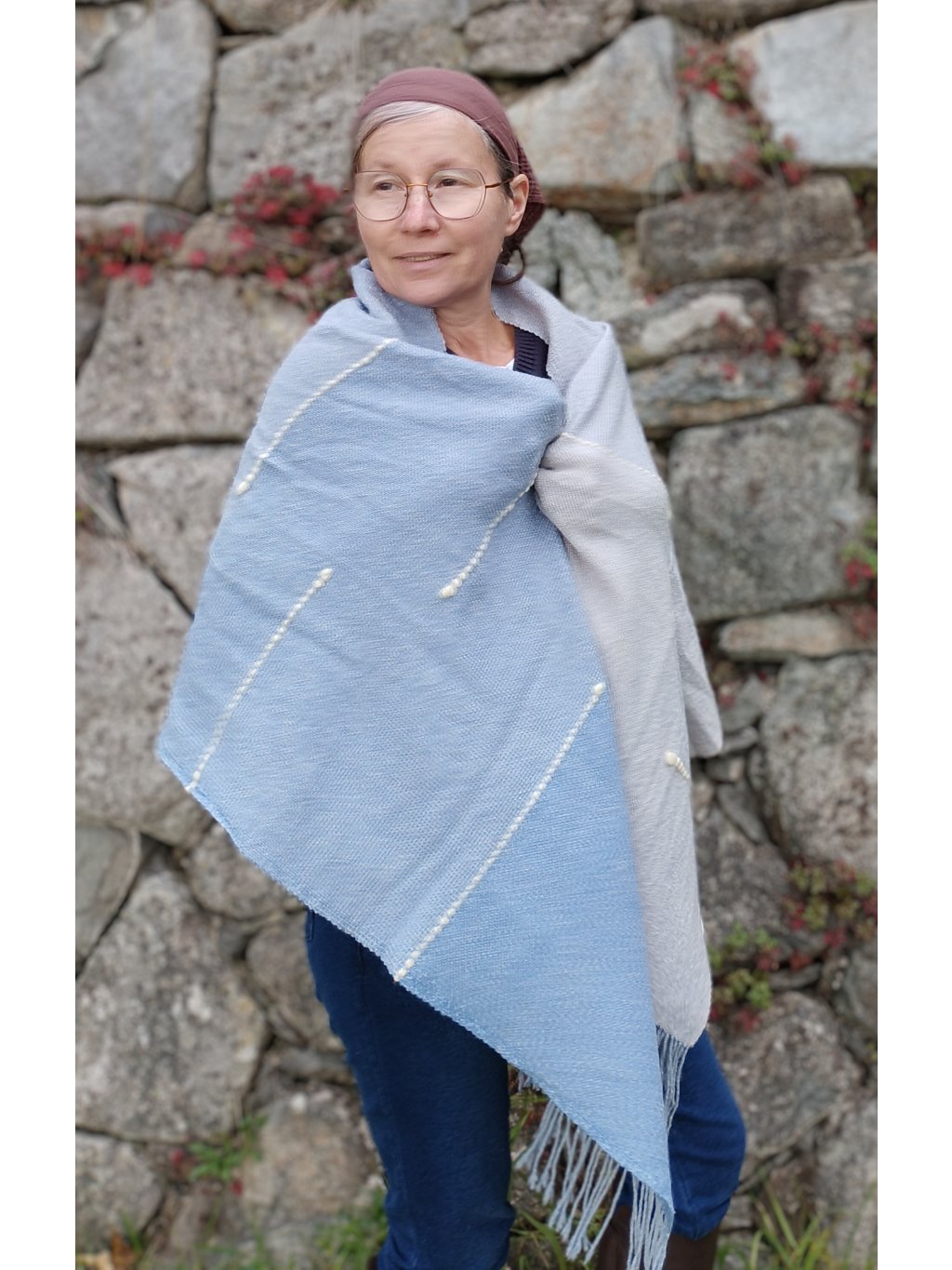 Ručně tkaná šála/pléd z jemné směsi jehněčí vlny 70% a hedvábí 30%. Použité barvy v útku jsou různé odstíny modré přecházející od tmavší po nejsvětlejší, to vše na světle modré osnově . Jednoduchost plátnové vazby umocňuje použitý materiál, jeho strukturu a barevnost. Na ozdobné vsadky jsem použila ručně předenou českou vlnu bílé barvy. Šála je velmi hřejivá, úžasně měkká a jemná, lehounká a příjemná na dotek, nekouše ani citlivé. Šála připomíná nebesky modrou oblohu. Je vhodná pro každý styl, pro ženy i muže a nosit ji lze celoročně. Šálu je možné 2 x pohodlně omotat kolem krku, nebo nosit jako pléd přes ramena. Výrobek je již jednou praný!!