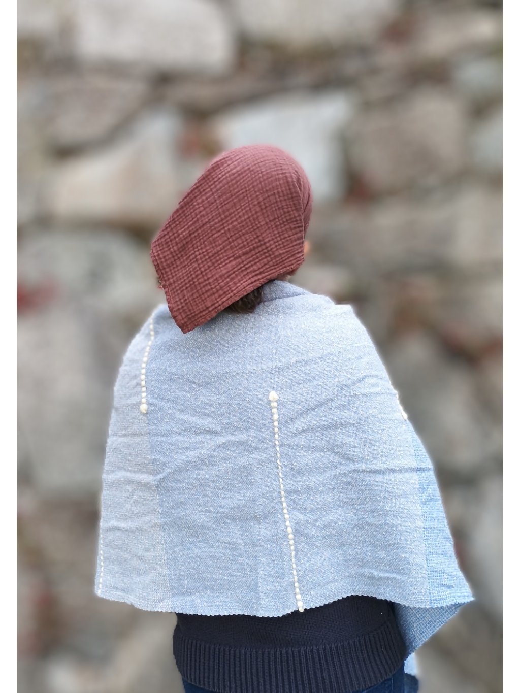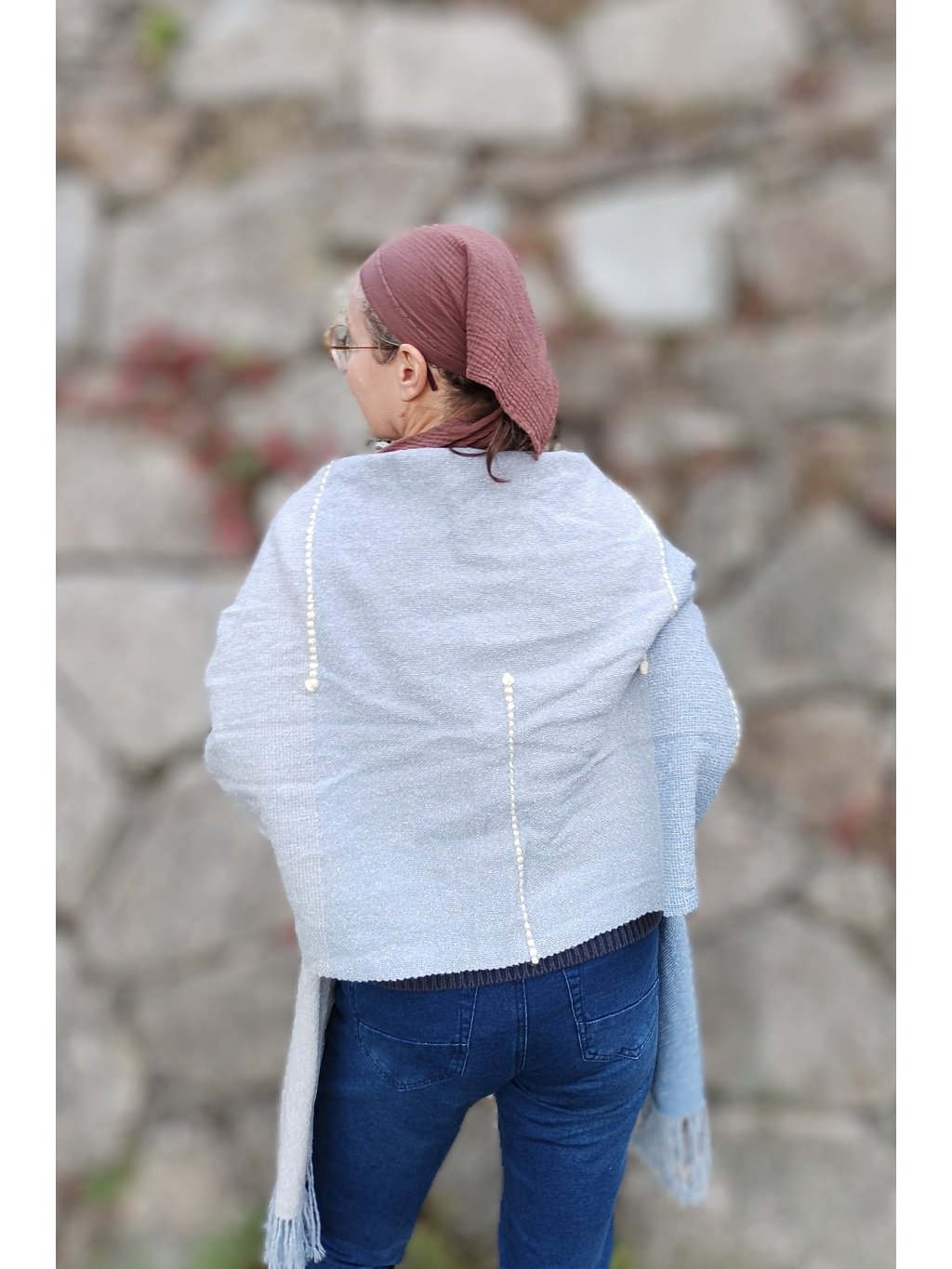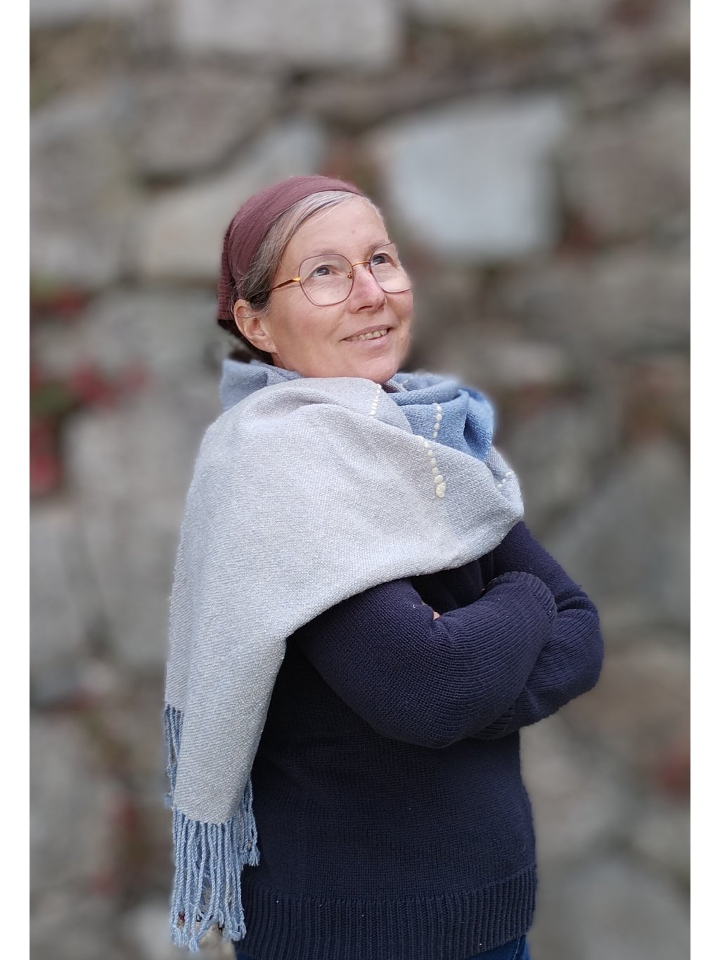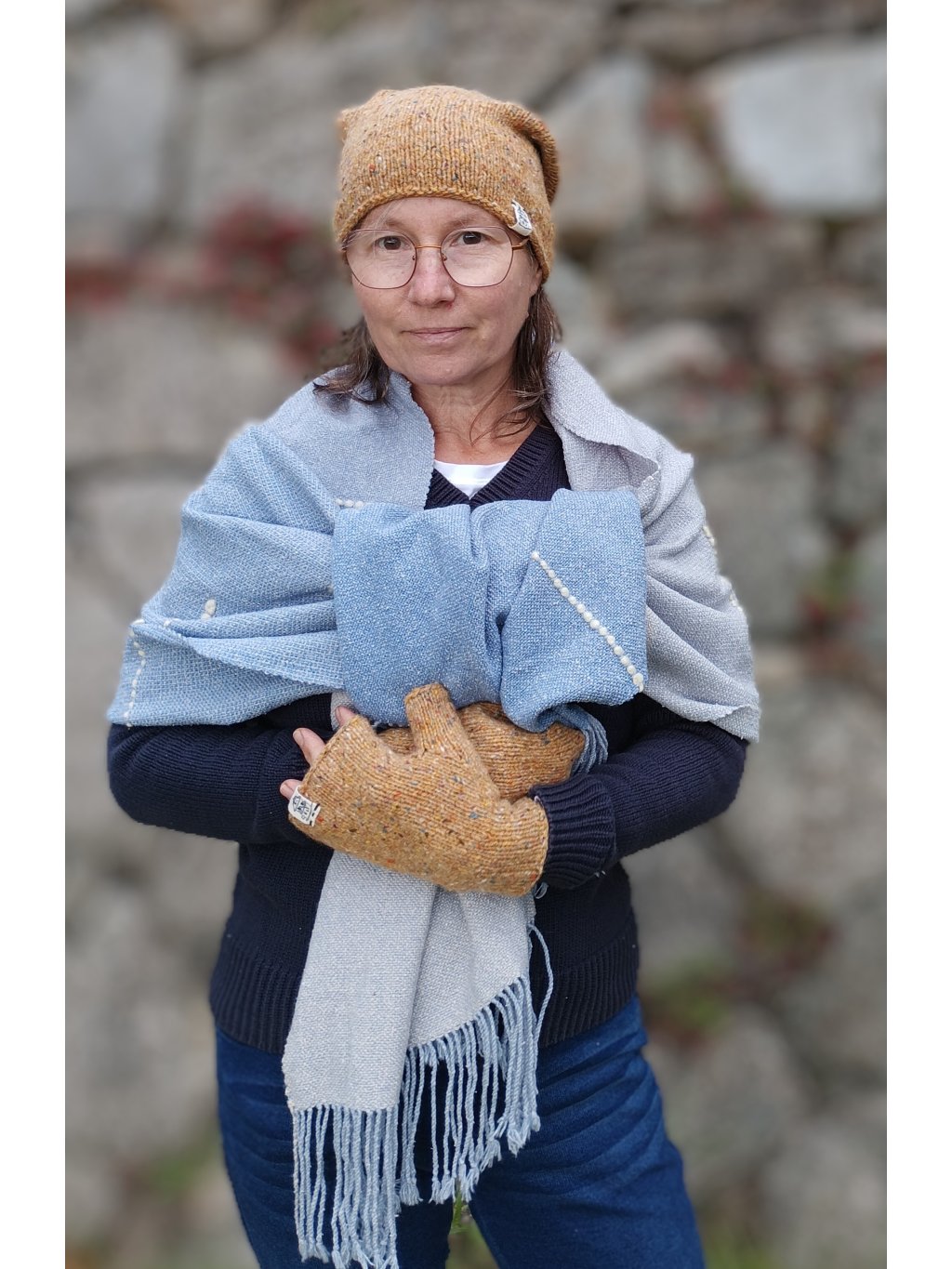 Ručně tkaná šála/pléd z jemné směsi jehněčí vlny 70% a hedvábí 30%. Použité barvy v útku jsou různé odstíny modré přecházející od tmavší po nejsvětlejší, to vše na světle modré osnově . Jednoduchost plátnové vazby umocňuje použitý materiál, jeho strukturu a barevnost. Na ozdobné vsadky jsem použila ručně předenou českou vlnu bílé barvy. Šála je velmi hřejivá, úžasně měkká a jemná, lehounká a příjemná na dotek, nekouše ani citlivé. Šála připomíná nebesky modrou oblohu. Je vhodná pro každý styl, pro ženy i muže a nosit ji lze celoročně. Šálu je možné 2 x pohodlně omotat kolem krku, nebo nosit jako pléd přes ramena. Výrobek je již jednou praný!!