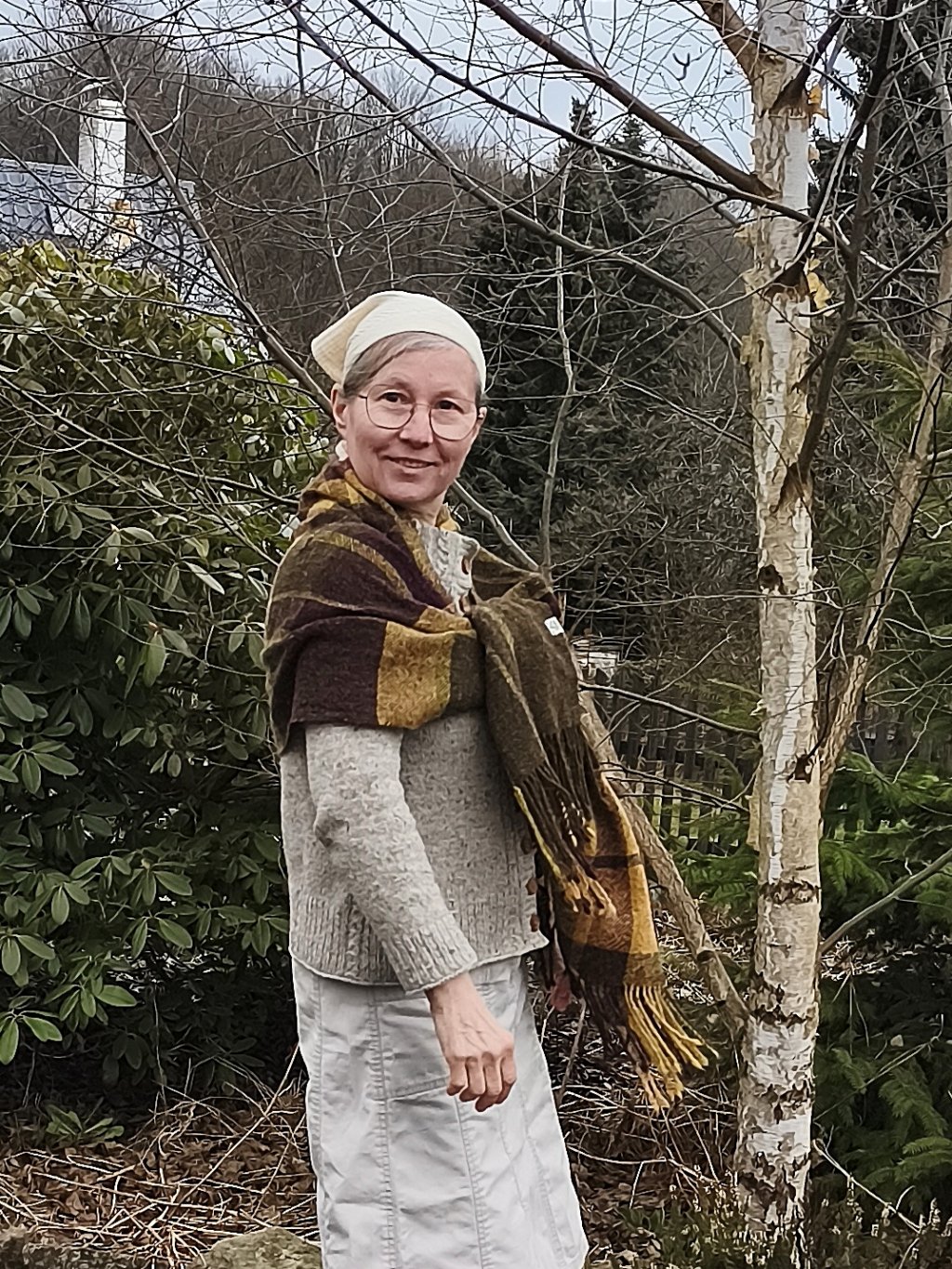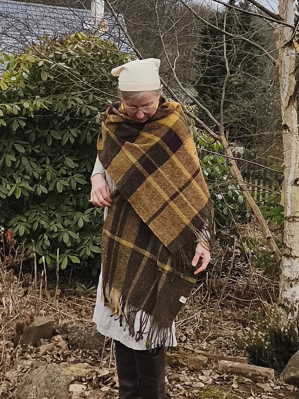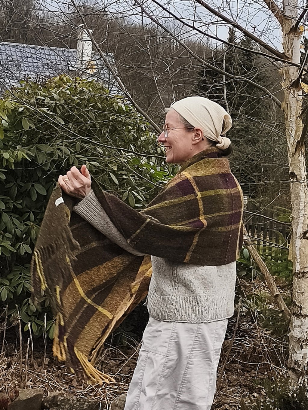 Ručně tkaná šála/pléd z tvídové merino vlny. Barevností znázorňuje tajemná zákoutí v přírodě, kde se mezi stromy a travinami skrývá květ temně vínovofialové barvy, dekorativní vsadky jsou z ručně předené české ovčí vlny v temně zelené barvě s kapkou hedvábí. Šála je velmi hřejivá, úžasně měkká a jemná, lehounká a příjemná na dotek, nekouše, ale mohou se najít výjimky s citlivější kůží. Použitý vzor je klasický a tradiční zároveň, osnova i útek jsou ze stejného materiálu a na obou stranách je zakončena kroucenými třásněmi. Barvami i vzorem je vhodná pro jakýkoliv styl a příležitost. Šálu je možné 2 x pohodlně omotat kolem krku, nebo nosit jako pléd přes ramena. Výrobek je již jednou praný!!