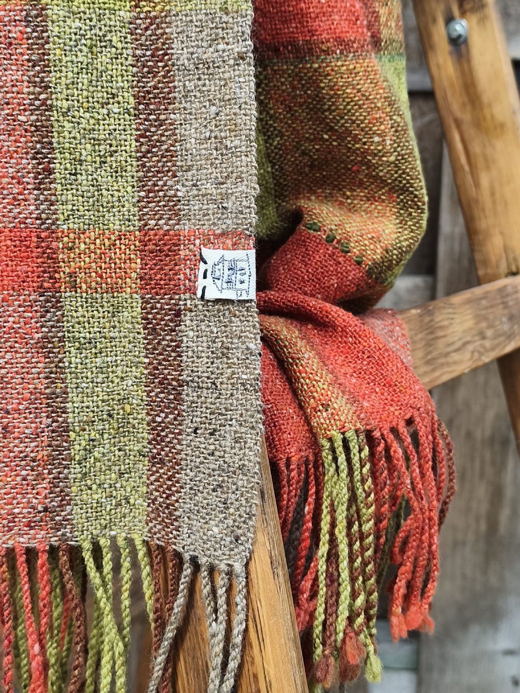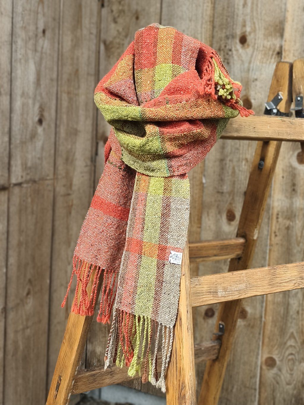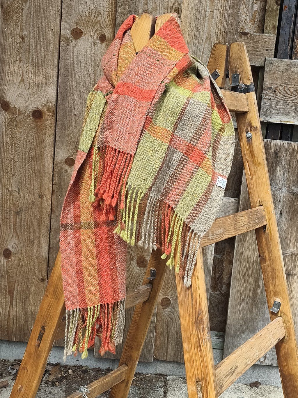 Ručně tkaná šála/pléd z tvídové merino vlny. Barevností pro mně znázorňuje pohodu, život s úsměvem, rozzářené oči nad barvami květin a šťavnatou zelení, tak proč se mračit. Dekorativní vsadky jsou z ručně předené tmavě zelené ovčí merino vlny. Šála je velmi hřejivá, úžasně měkká a jemná, lehounká a příjemná na dotek, nekouše, ale mohou se najít výjimky s citlivější kůží. Použitý vzor je klasický a tradiční zároveň, osnova i útek jsou ze stejného materiálu a na obou stranách je zakončena kroucenými třásněmi. Barvami i vzorem je vhodná pro jakýkoliv styl a příležitost. Šálu je možné 2 x pohodlně omotat kolem krku, nebo nosit jako pléd přes ramena. Výrobek je již jednou praný!!
