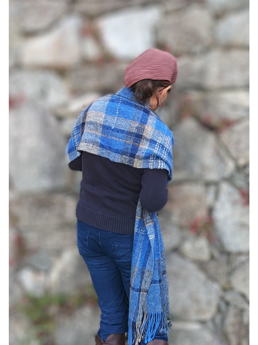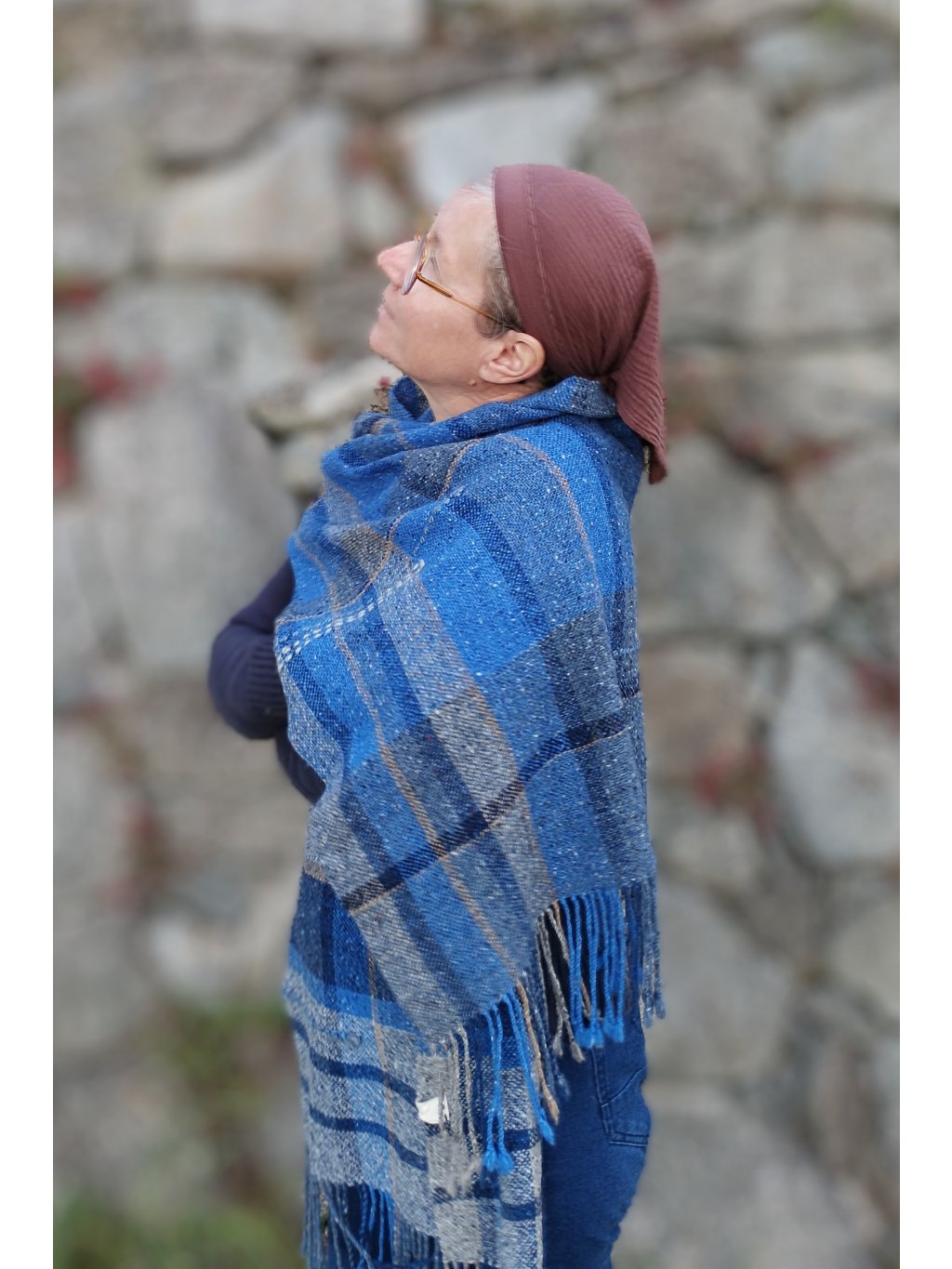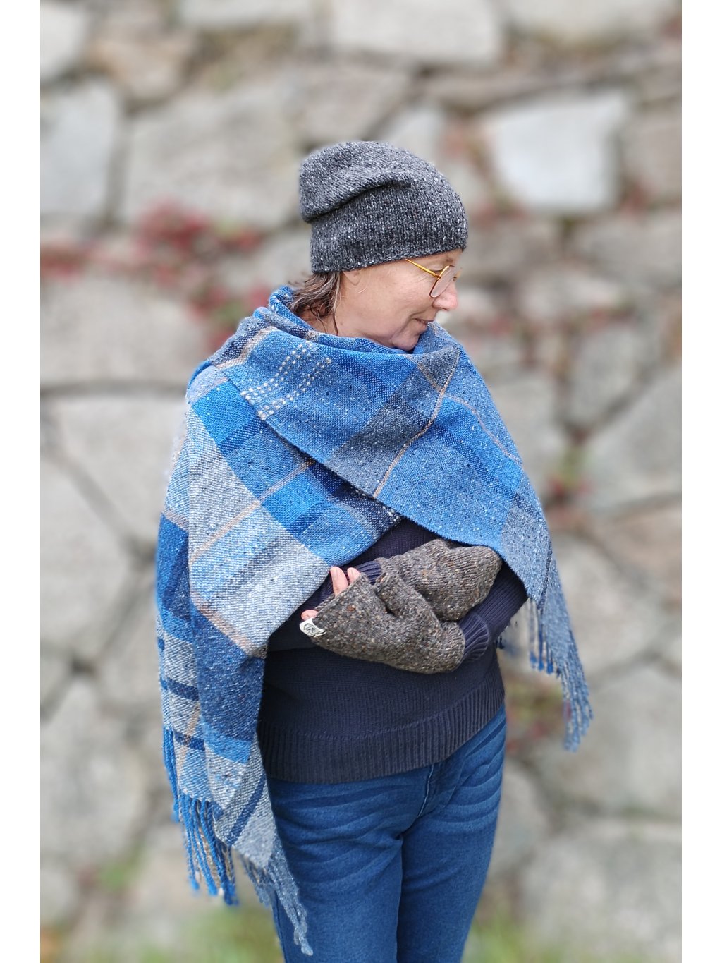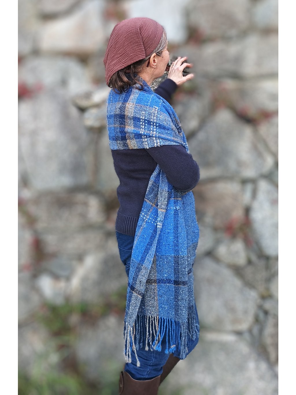 Ručně tkaná šála/pléd z tvídové merino vlny. Barevností připomíná podvečer za jasné oblohy, která přechází z blankytně modré do tmavé až temné a v místě, kde se setkává s horizontem, zaznívají tóny země, nádech hnědé a šedé. Dekorativní vsadky v geometrických liniích jsou z ručně předené české ovčí vlny v přírodně bílé. Šála je velmi hřejivá, úžasně měkká a jemná, lehounká a příjemná na dotek, nekouše, ale mohou se najít výjimky s citlivější kůží. Použitý vzor je klasický a tradiční zároveň, osnova i útek jsou ze stejného materiálu a na obou stranách je zakončena kroucenými třásněmi. Barvami i vzorem je vhodná pro jakýkoliv styl a příležitost, pro ženy i muže. Šálu je možné 2 x pohodlně omotat kolem krku, nebo nosit jako pléd přes ramena. Výrobek je již jednou praný!!