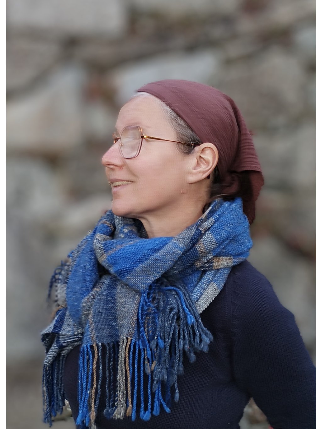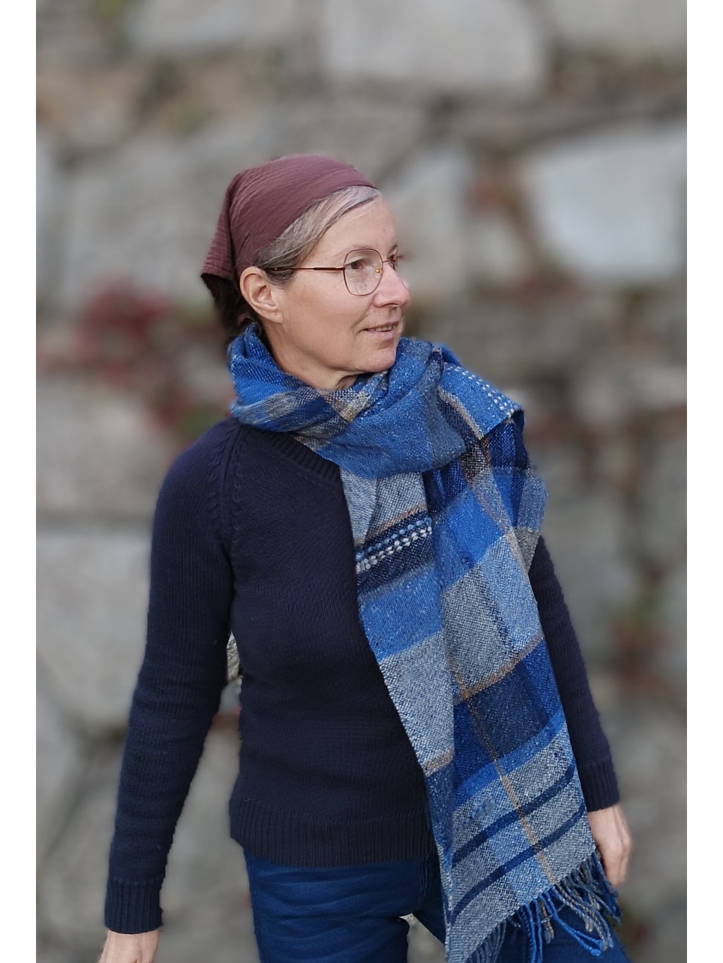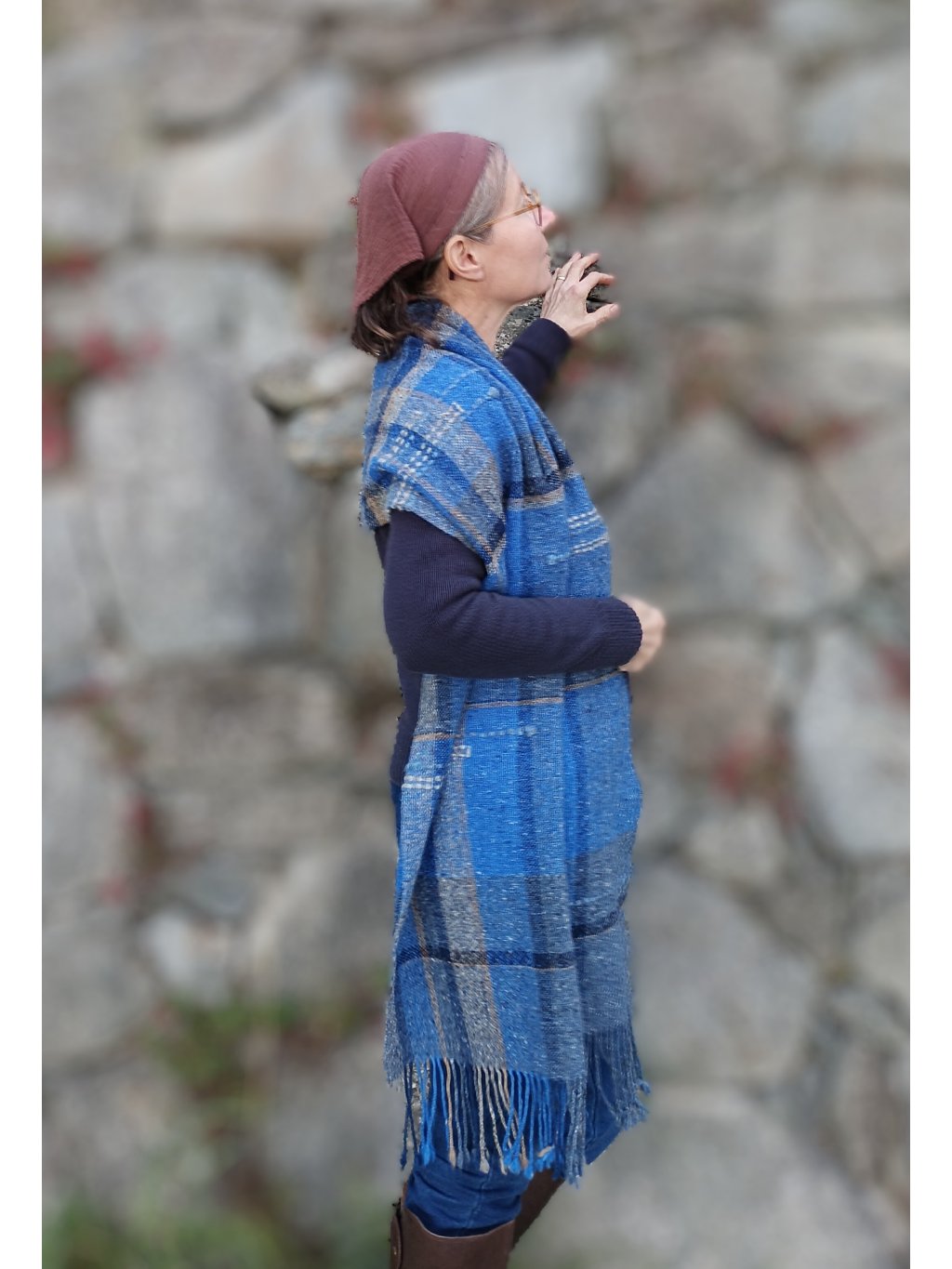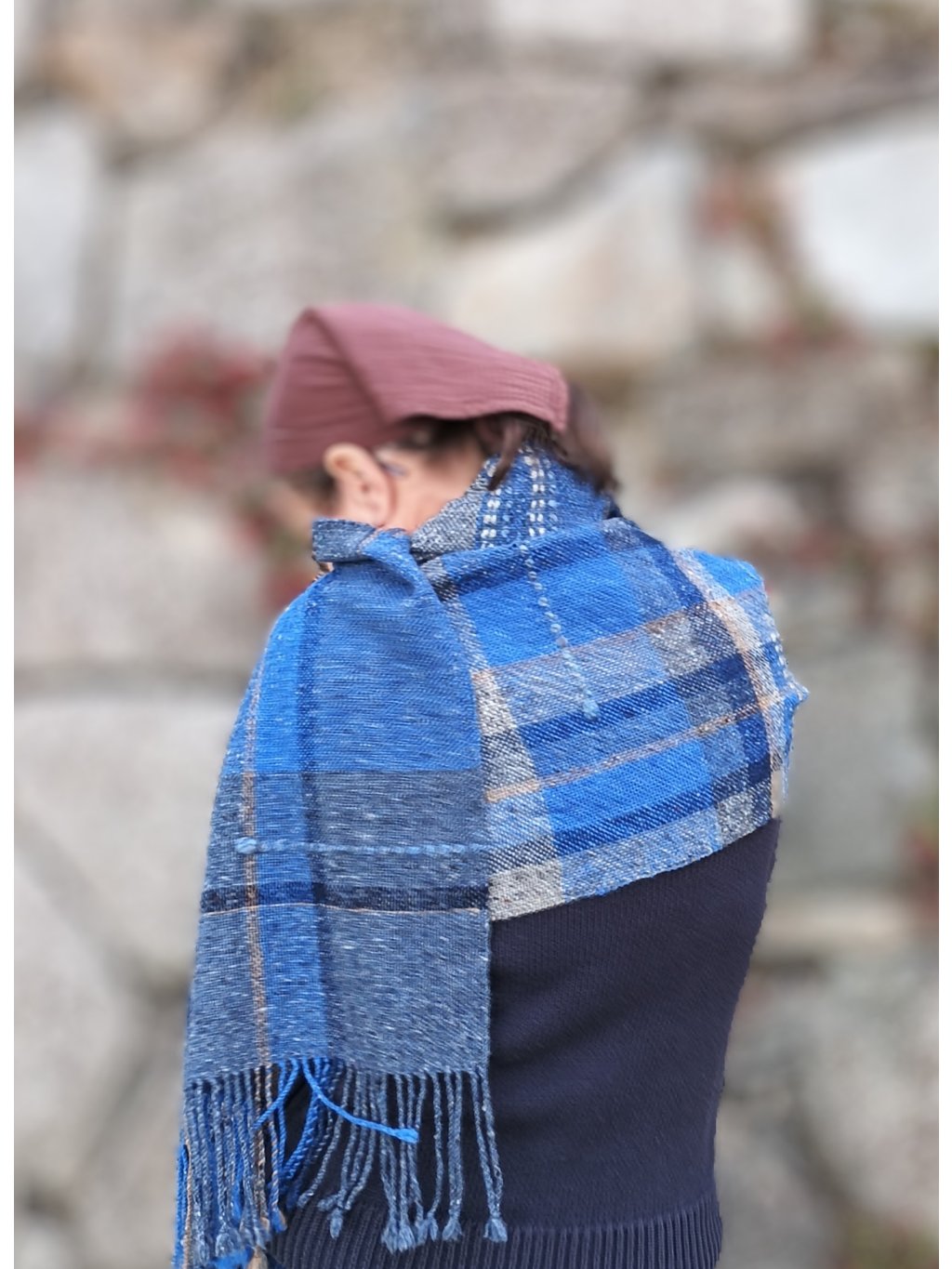 Ručně tkaná šála/pléd z tvídové merino vlny. Barevností připomíná podvečer za jasné oblohy, která přechází z blankytně modré do tmavé až temné a v místě, kde se setkává s horizontem, zaznívají tóny země, nádech hnědé a šedé. Dekorativní vsadky v geometrických liniích jsou z ručně předené české ovčí vlny v přírodně bílé. Šála je velmi hřejivá, úžasně měkká a jemná, lehounká a příjemná na dotek, nekouše, ale mohou se najít výjimky s citlivější kůží. Použitý vzor je klasický a tradiční zároveň, osnova i útek jsou ze stejného materiálu a na obou stranách je zakončena kroucenými třásněmi. Barvami i vzorem je vhodná pro jakýkoliv styl a příležitost, pro ženy i muže. Šálu je možné 2 x pohodlně omotat kolem krku, nebo nosit jako pléd přes ramena. Výrobek je již jednou praný!!