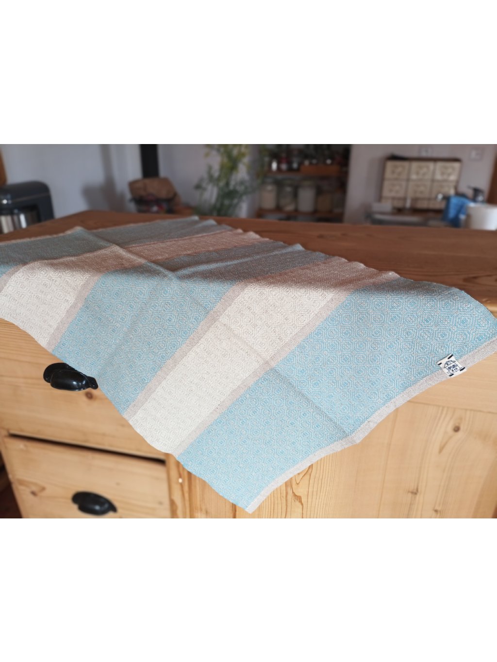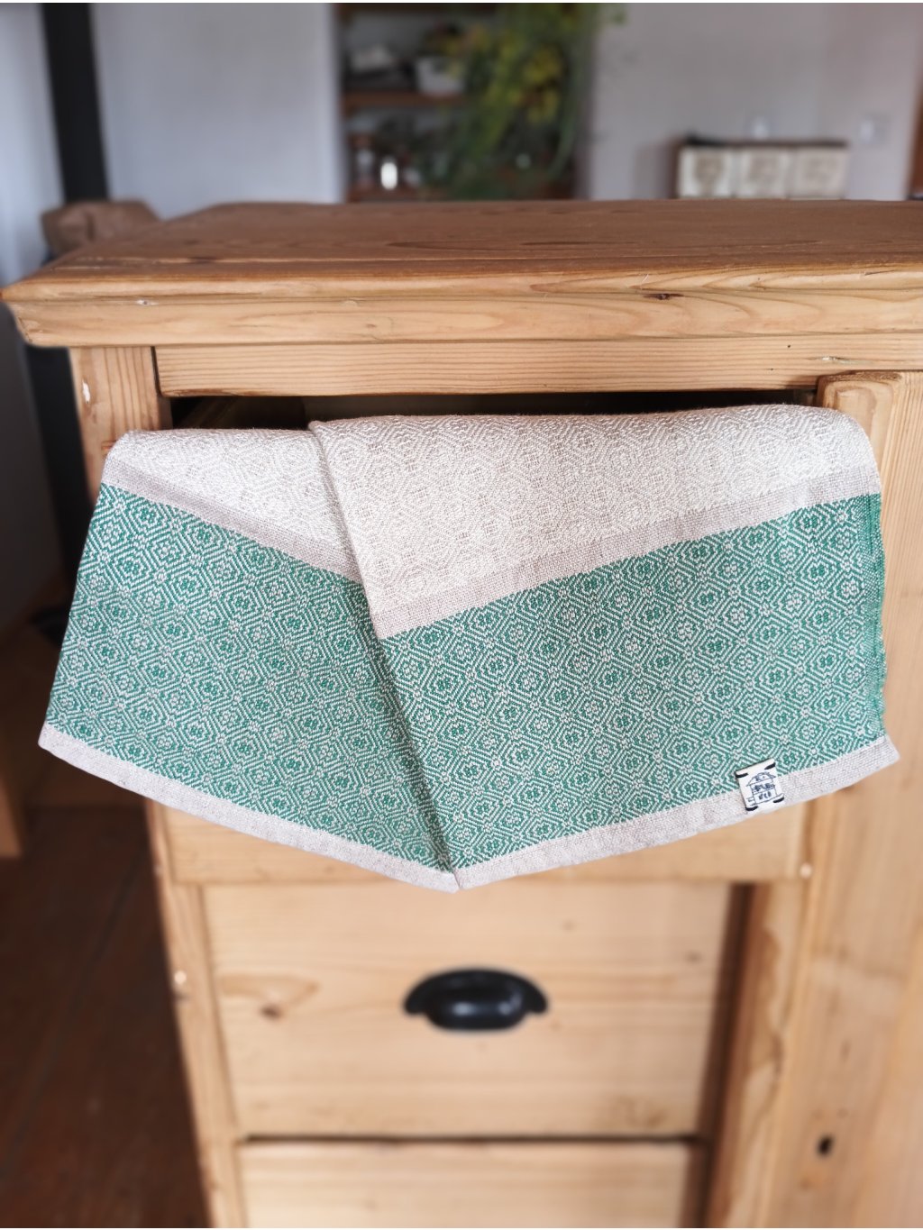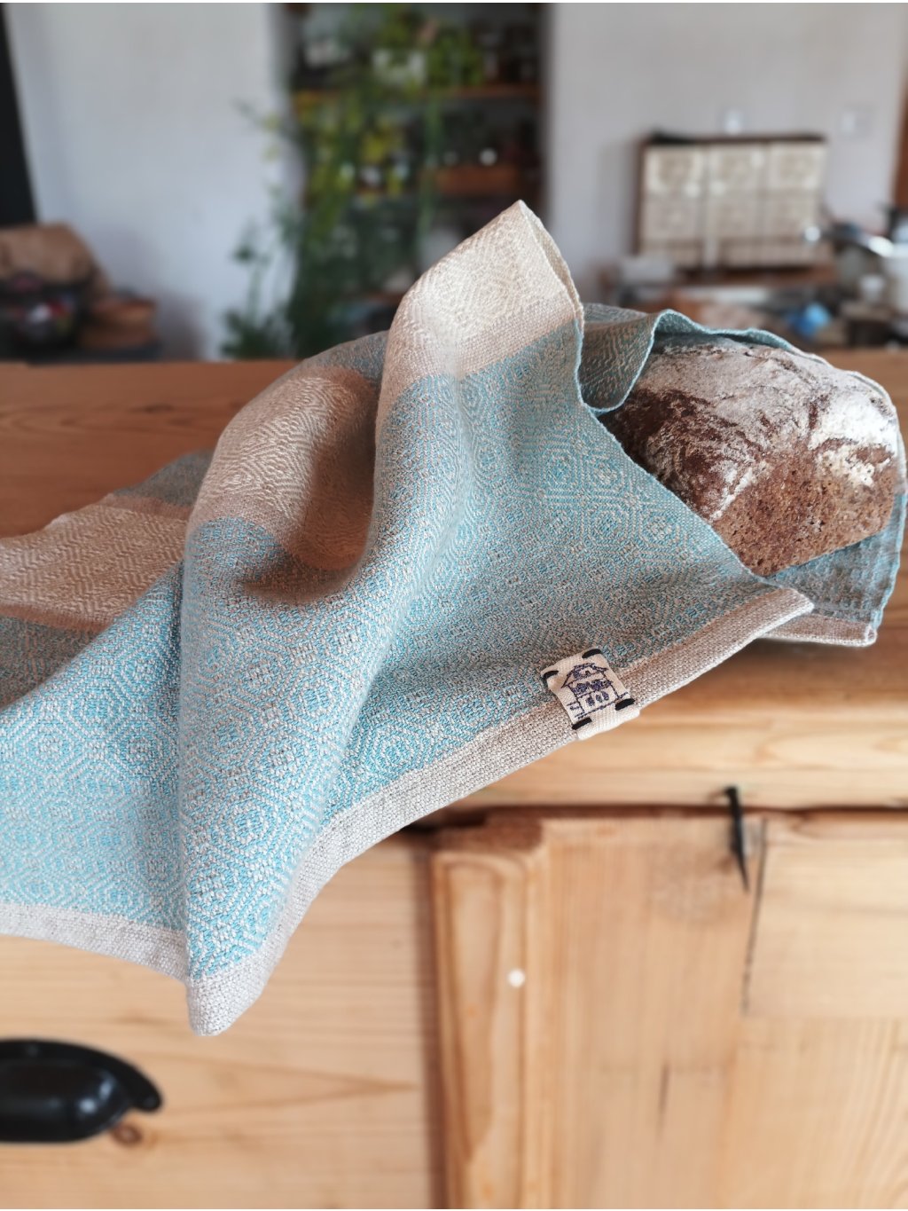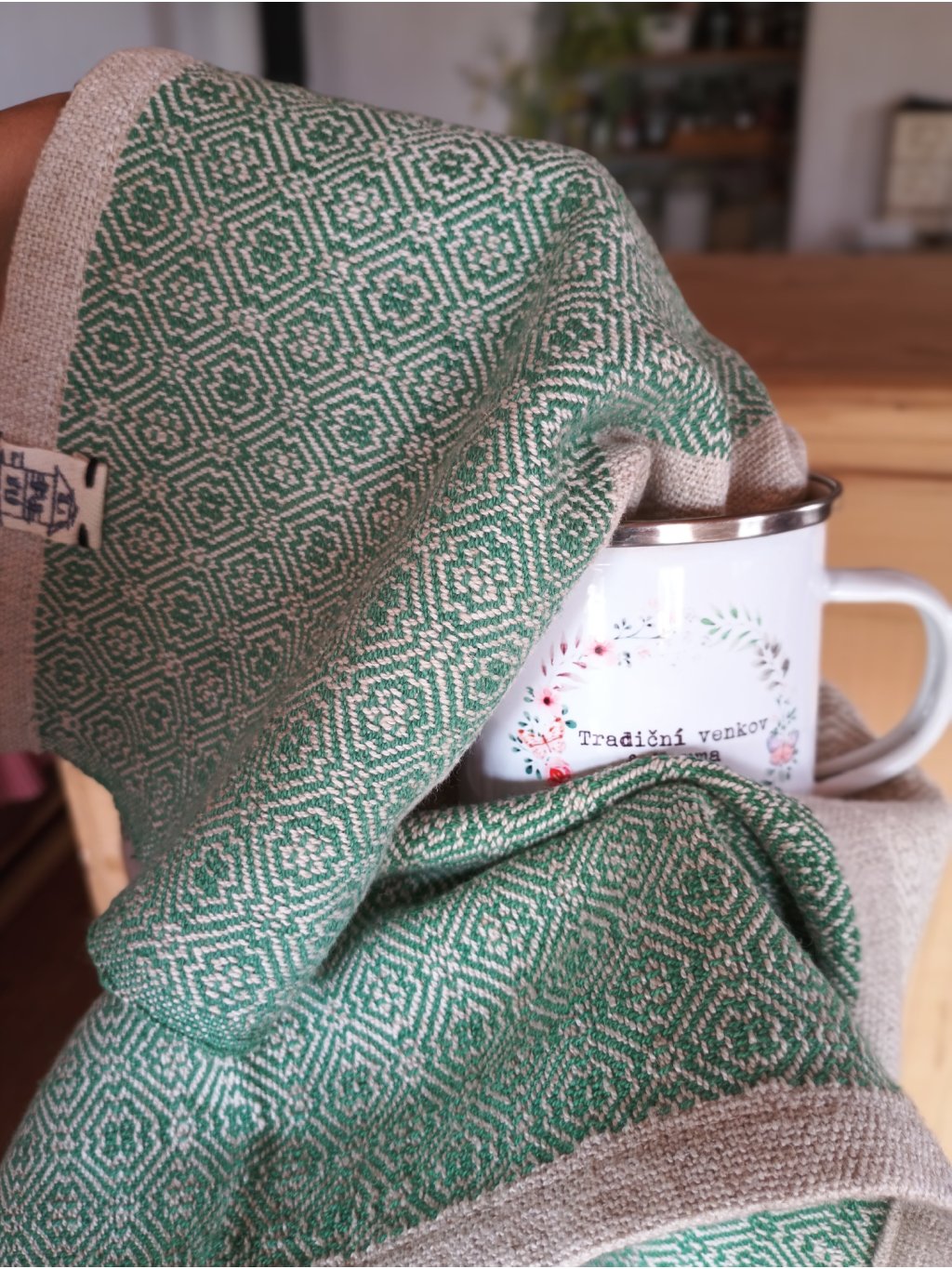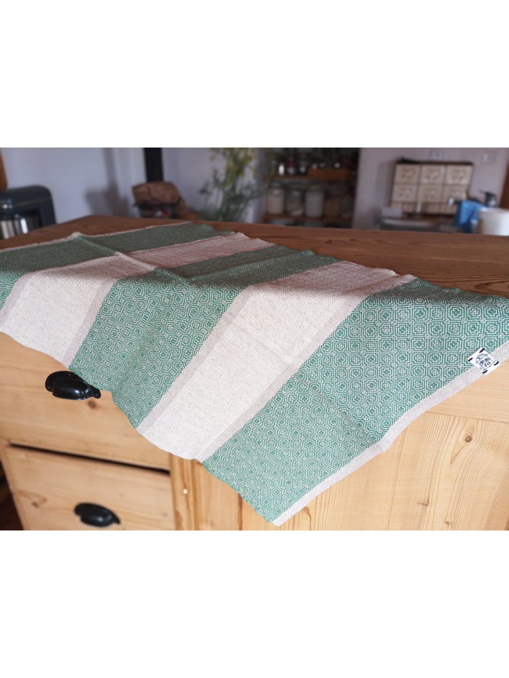Použít se dá jako středový ubrus, dečka, nebo ručník, či utěrka na nádobí nebo na uchování domácího chleba. V rubové straně je schované poutko upletené ze stejné barvy. Vzor je v podstatě oboustranný, použitelný jak z lícu, tak z rubu. Použitý vzor je nadčasový i nadstylový, prostě se hodí všude.